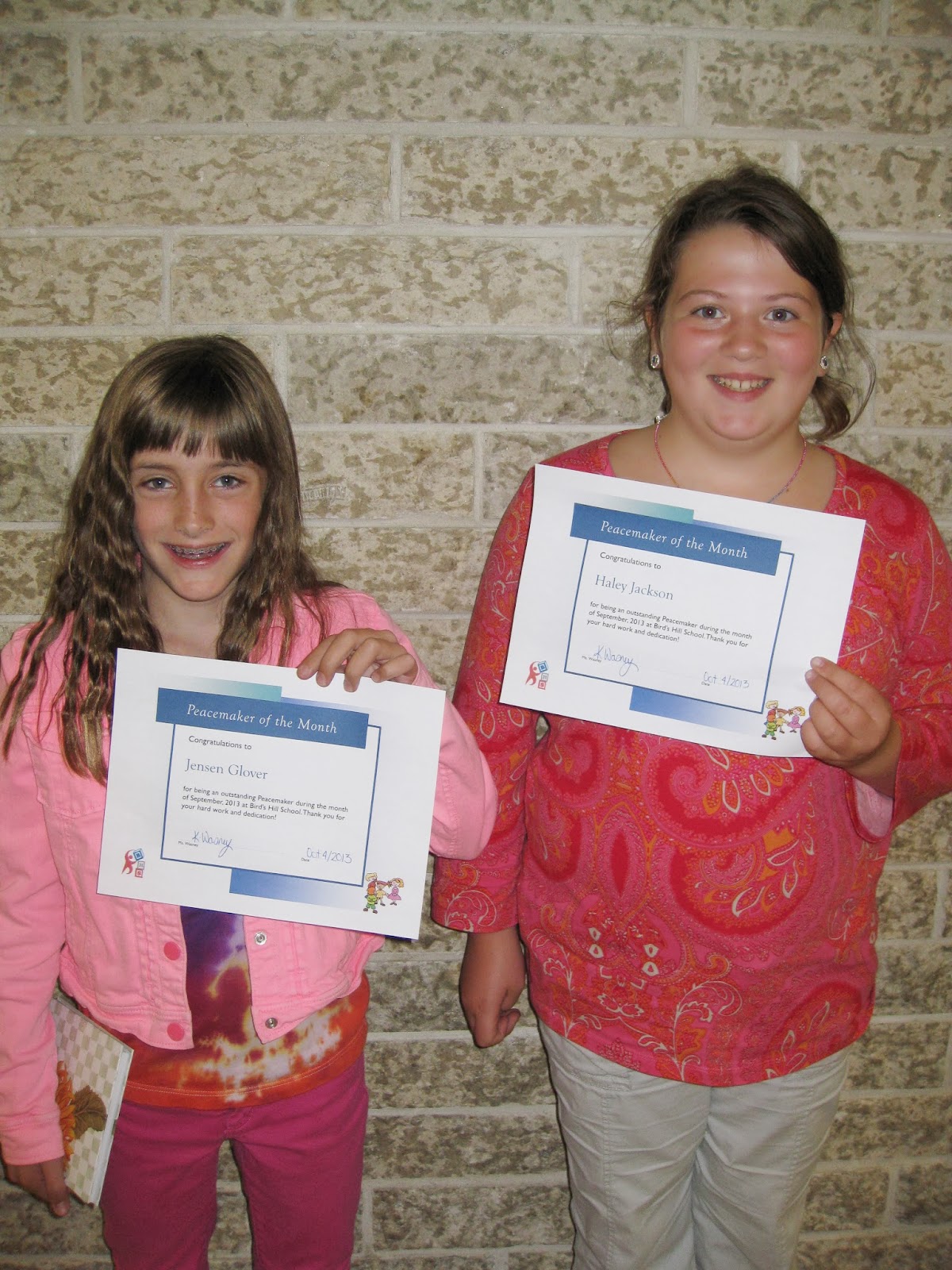 Congratulations to Jensen and Haley for being named Peacemakers of the Month for September! Thanks for your dedication all month long! Jensen and Haley make a great team! They are consistently out on their assigned days, always remember to sign in, and they fill out the forms appropriately. Both girls are always willing to sub for other Peacemakers when needed. Way to go girls!